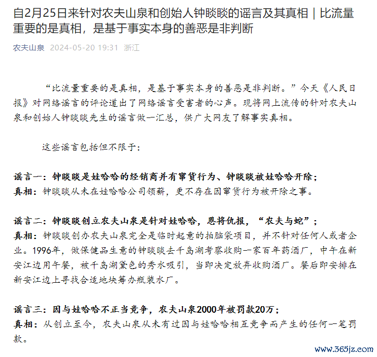 4.农夫山泉从未发表过酸碱体质理论,更没有被央视3.15点名。